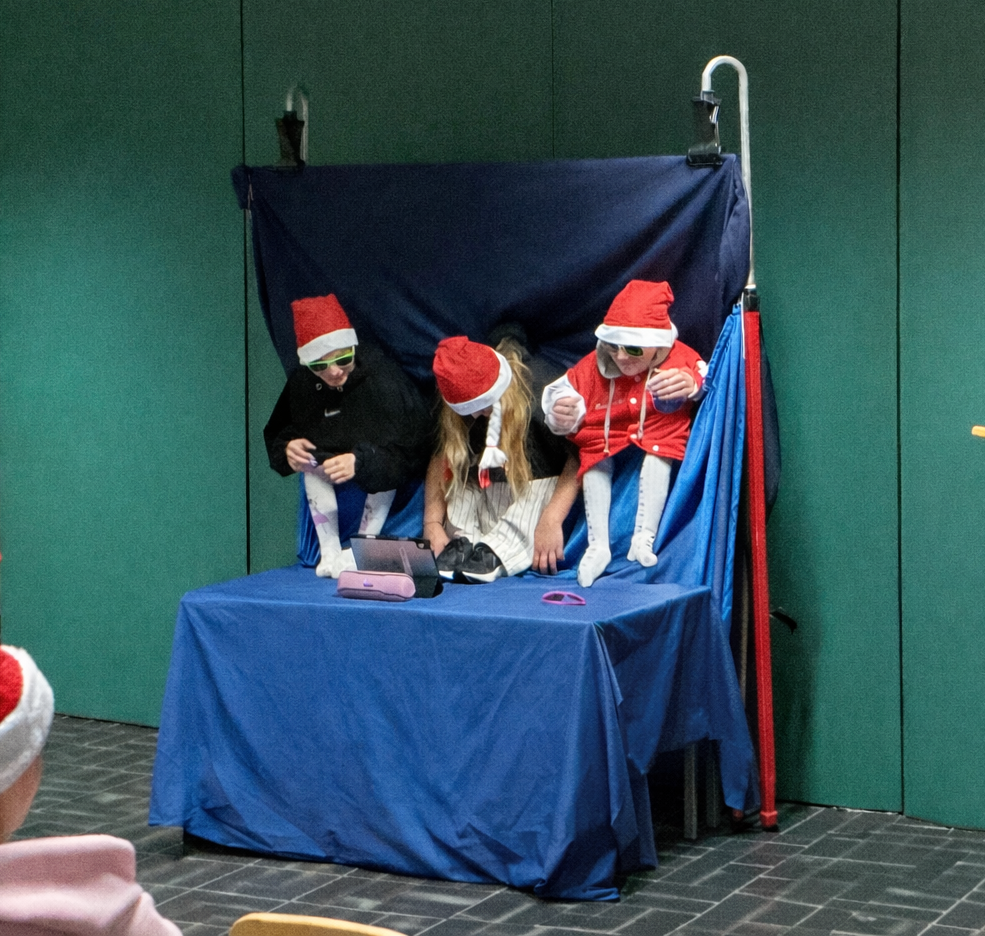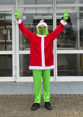 Klasse 9 (siehe oben) begeisterte mit einem Wichteltanz. Die Klasse 8L trug ein Weihnachtsgedicht in Jugendsprache vor und bei der Klasse 8E gab es das traditionelle Weihnachtsquiz, bei dem wieder Schoko-Weihnachtsmänner gewonnen werden konnten. Klasse 7 gab eine runde Weihnachtskekse aus und die Klassen 5 und 6 trugen verschiedene Gedichte vor. Auch der Grinch kam dieses Jahr wieder zu Besuch.