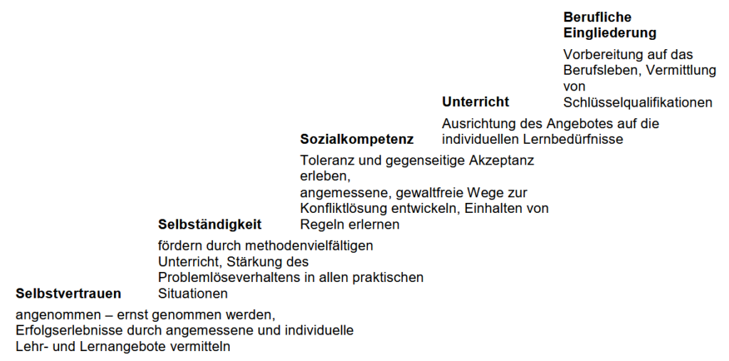 An unserer Schule wollen wir die Schülerinnen und Schüler dazu befähigen, mit sich selbst und ihrer Umwelt zurechtzukommen, um schließlich in größtmöglicher Selbständigkeit erfolgreich am Leben der Gesellschaft teilnehmen zu können.
